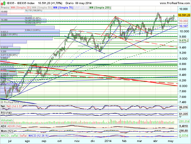 Por lo que se refiere al aspecto técnico del Ibex, en el medio plazo, desarrolla un impulso alcista, hasta los 10.650.