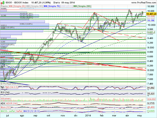 Por lo que se refiere al aspecto técnico del Ibex, en el medio plazo, desarrolla un impulso alcista, hasta los 10.650.