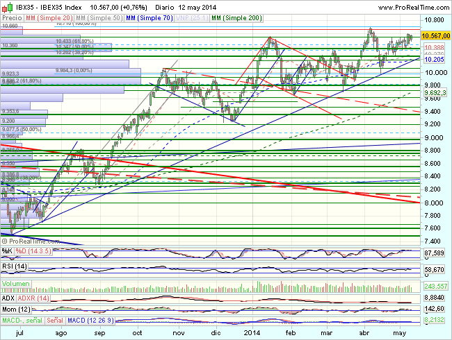 Por lo que se refiere al aspecto técnico del Ibex, en el medio plazo, desarrolla un impulso alcista, hasta los 10.650.
