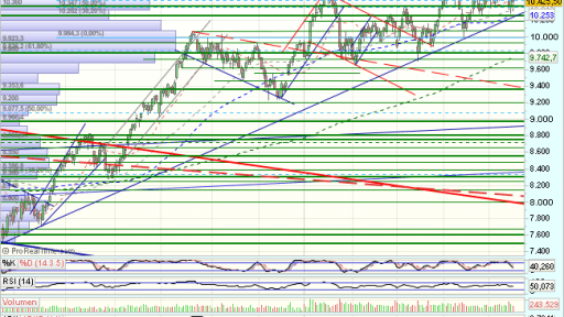 El soporte en los 10.360 sigue aguantado, por lo que mientras no veamos su perdida con un filtro a 10.250, es posible que el ibex reanude su impulso alcista, con objetivos en los 10.720 – 11.000 puntos, si bien habra que ver precios sobre los 10.720 para ver alejarse el peligro.