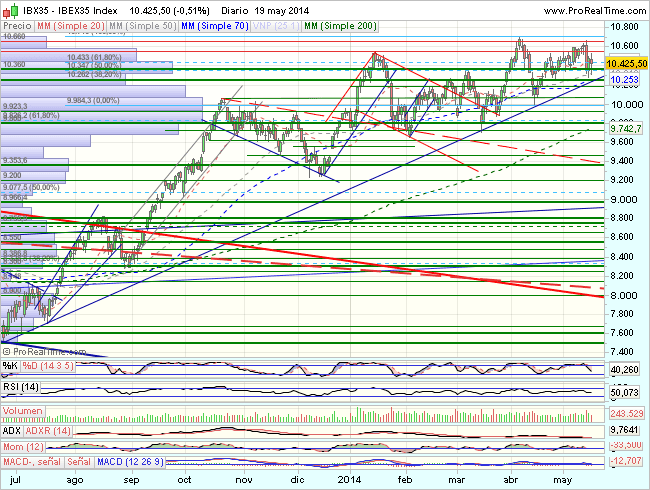 Por lo que se refiere al aspecto técnico del Ibex, en el medio plazo, desarrolla un impulso alcista, hasta los 10.650.