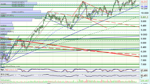 Por lo que se refiere al aspecto técnico del Ibex, en el medio plazo, desarrolla un impulso alcista, hasta los 10.650.