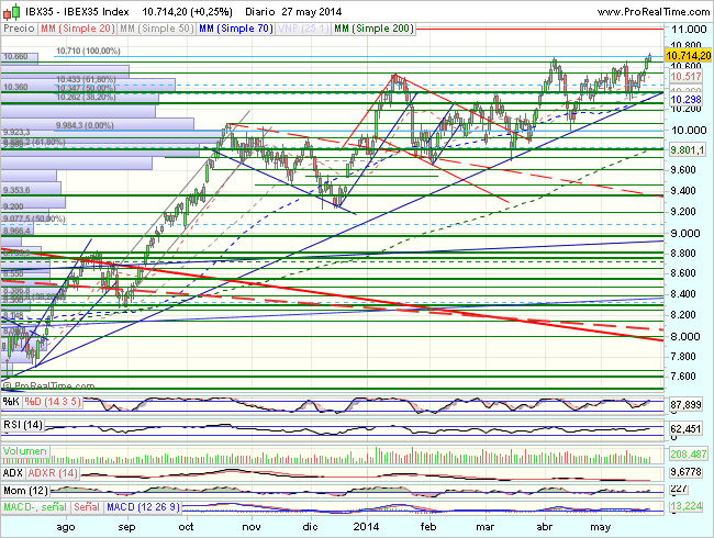 El Ibex supera la resistenciay máximos previos en los 10.705 puntos, cuya confirmacion daria por terminado el movimiento lateral, y abriria nuevos objetivos en los 11.000 – 11.210 puntos .