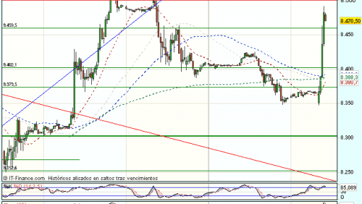 El Ibex 35 ha iniciado la sesión bajo presión compradora, y cotiza durante la sesión con perdidas del 0,75%, hasta los 8.482,50 puntos, acercándose a la resistencia relevante en los 8.500 puntos.