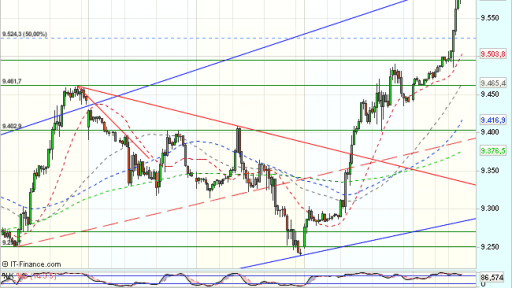 El Ibex 35 se encuentra bajo presión compradora en la sesión de hoy, tras apoyarse en el nivel de los 9.250 puntos, y cotiza durante la jornada, con beneficios del 1,54% hasta los 9.584,50 puntos.
