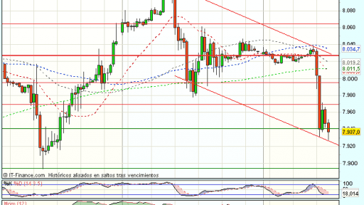 El Ibex 35 se encuentra bajo presión vendedora en la sesión de hoy, arrastrado por las eléctricas, y cotiza durante la sesión con perdidas del 1,19%, hasta los 7.935,50 puntos, perforando el soporte de los 7.950 puntos.