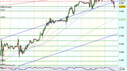 El Ibex 35 se encuentra bajo presión vendedora en la sesión de hoy, frenado ante los 8.950 puntos, donde aparecen ventas y cotiza durante la jornada, con perdidas del 0,56% hasta los 8.874,50 puntos.