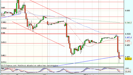 El Ibex 35 ha iniciado la sesión bajo presión vendedora, frenado ante la resistencia de los 8.500 puntos, y cotiza durante la sesión con perdidas del 0,93%, hasta los 8.379,50 puntos, ya por debajo del nivel de los 8.400 puntos.