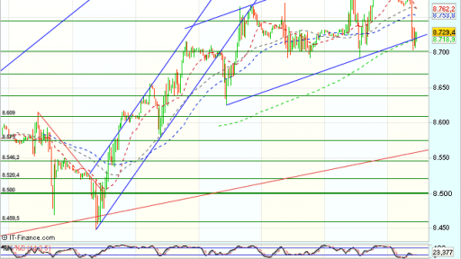 El Ibex 35 se encuentra bajo presión vendedora en la sesión de hoy, aunque encuentra nuevamente algún apoyo, en el soporte de los 8.700 puntos, donde aparecen compras y cotiza con perdidas del 0,42%, hasta los 8.721,50 puntos.