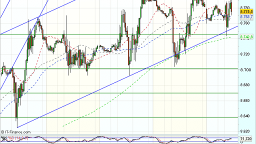 El Ibex 35 se encuentra volátil en la sesión de hoy, aunque parece encontrar algún apoyo, en el soporte de los 8.750 puntos, donde aparecen compras y cotiza con perdidas del 0,07%, hasta los 8.783,50 puntos.