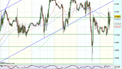 El Ibex 35 se encuentra volátil en la sesión de hoy, a vueltas con la resistencia en los 8.750 puntos, y cotiza durante la jornada, prácticamente plano con beneficios del 0,01%, hasta los 8.738,50 puntos.