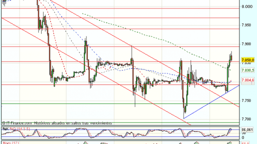 El Ibex 35 ha iniciado la sesión bajo presión compradora manteniendo la recuperación iniciada en la sesión de ayer, y cotiza durante la sesión con beneficios del 0,74%, hasta los 7.870,50 puntos, superando la resistencia de los 7.850 puntos.