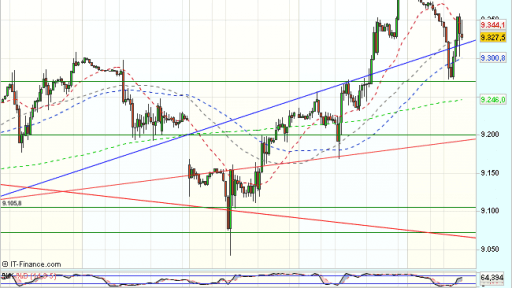 El Ibex 35 se encuentra volátil en la sesión de hoy, frenado ante el nivel de los 9.400, y parece encontrar apoyos en el entorno de los 9.270 puntos, cotiza durante la jornada, con perdidas del 0,19% hasta los 9.319,50 puntos.