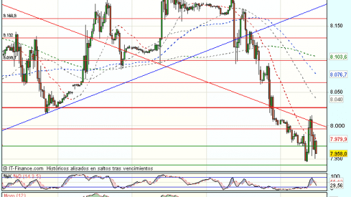 El Ibex 35 se encuentra bajo fuerte presión vendedora en la sesión de hoy, con algunas compras en el entorno de los 7.950 puntos, y cotiza durante la sesión, con perdidas del 1,64%, hasta los 7.965,50 puntos.