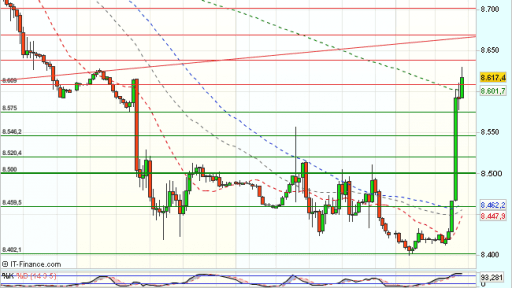 El Ibex 35 se encuentra bajo fuerte presión compradora en la sesión de hoy superando la resistencia de los 8.550 puntos, tras las abultadas caídas de las jornadas pasadas, y cotiza durante la jornada, con beneficios del 1,85%, hasta los 8.618,50 puntos, por encima del soporte de los 8.600 puntos.