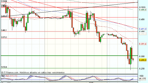 El Ibex 35 ha iniciado la sesión bajo fuerte presión vendedora y amplio gap bajista con incremento de volumen, aunque ha encontrado apoyos en el nivel clave de los 8.250 puntos que aminoran las caídas, y cotiza durante la sesión prácticamente plano con perdidas del 2,10%, hasta los 8.284,50 puntos.
