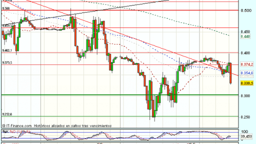 El Ibex 35 ha iniciado la sesión bajo presión, aunque han presionado las ventas en el nivel de los 8.400 puntos, y cotiza durante la sesión con perdidas del 0,16%, hasta los 8.330,50 puntos, aun por encima del soporte en los 8.300 puntos.