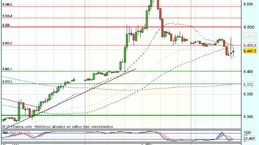 El Ibex 35 se encuentra bajo presión vendedora en la sesión de hoy, aunque esta intentando estabilizarse en el entorno de los 8.430 puntos y cotiza con perdidas del 0,75%, hasta los 8.447,50 puntos, por encima de la resistencia relevante de los 8.400 puntos.
