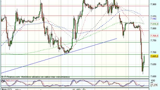 El Ibex 35 se encuentra bajo fuerte presión vendedora en la sesión de hoy, y con amplio gap bajista aunque parece estar encontrando algún apoyo en el nivel de los 7.600 puntos y cotiza durante la sesión, con perdidas del 2,49%, hasta los 7.690,50 puntos.