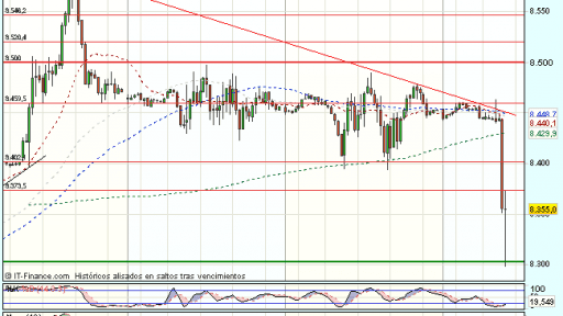 El Ibex 35 se mantenía bajo fuerte presión vendedora en la sesión de hoy, alcanzando el soporte en los 8.300 puntos, donde aparecen compras y cotiza durante la sesión, con perdidas del 0,81%, hasta los 8.365,50 puntos.