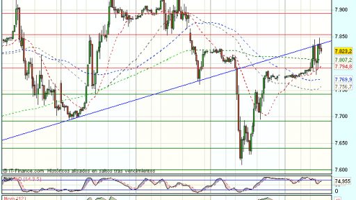 El Ibex 35 se encuentra bajo presión compradora en la sesión de hoy aunque no exenta de volatilidad y cotiza durante la sesión, con beneficios del 0,79%, hasta los 7.825,50 puntos, recuperando el nivel de los 7.800 puntos.