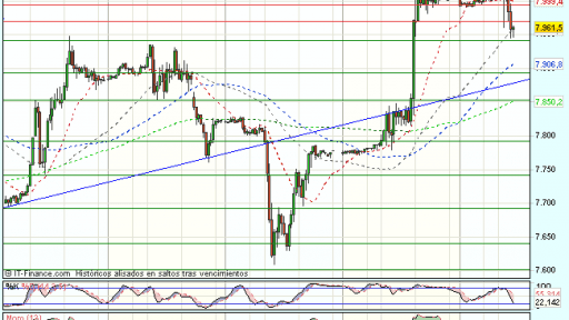 El Ibex 35 se encuentra bajo presión vendedora en la sesión de hoy, en recogida de beneficios tras las alzas de ayer, y cotiza durante la sesión, con perdidas del 0,62%, hasta los 7.952,50 puntos, frenado ante la resistencia de los 8.030 puntos.