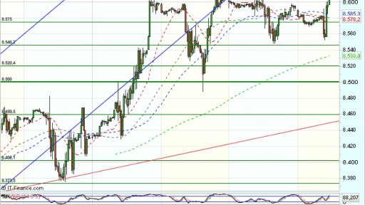 El Ibex 35 se encuentra bajo presión compradora en la sesión de hoy, atacando la resistencia de los 8.610 puntos, que ha llegado a superar durante la sesión, y cotiza con beneficios del 0,56%, hasta los 8.608,50 puntos.