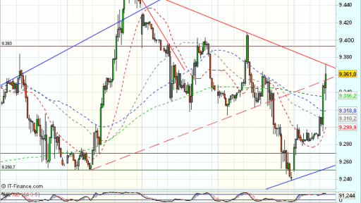 El Ibex 35 se encuentra bajo presión compradora en la sesión de hoy, tras apoyarse en el nivel de los 9.250 puntos, y cotiza durante la jornada, con beneficios del 0,40% hasta los 9.356,50 puntos.