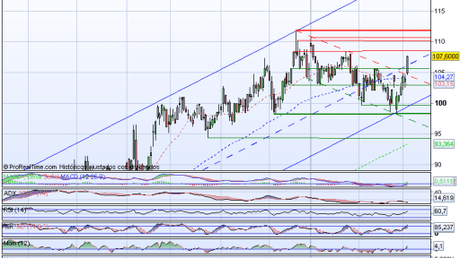 – Estocástico en zona de sobrecompra y alcista; y RSI en zona neutra y alcista.En definitiva el valor se encuentra en fase lateral de consolidación con renovadas connotaciones alcistas que lo enfrentan a las resistencias de 108,5 110,2 y máximo de 111,8 que, de superar, lo situarán de nuevo en subida libre. Por abajo presenta soportes en 105,55 103,00 99,65 y el más importante de 98,25 que, de perder, lo llevaría posiblemente hasta los 94.