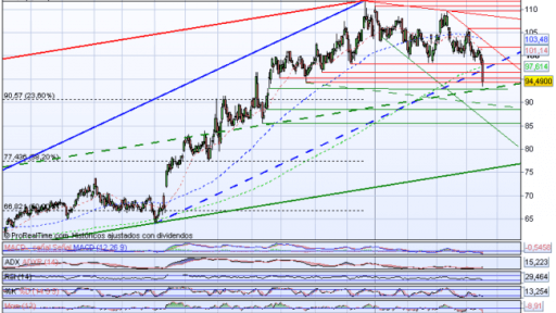 Las acciones de Inditex cayeron un 4,08% en la sesión hasta los 94,49 euros. Los títulos del gigante textil marcaron mínimos de siete meses, desde que el 18 de septiembre cotizaron a 91,75 euros.