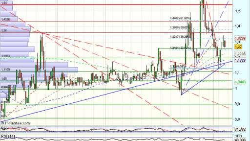 Tras una violenta consolidación vuelve a impulsarse en los 0,75 hasta los 1,36, que dan paso a otro impulso bajista, derivando en un rango lateral, con base en el soporte de 1 euro, que pudiera ser de continuidad o agotamiento.