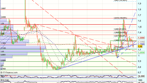 Tras una violenta consolidación vuelve a impulsarse en los 0,75 hasta los 1,36, que dan paso a otro impulso bajista, derivando en un rango lateral, con base en el soporte de 1 euro, que pudiera ser de continuidad o agotamiento.