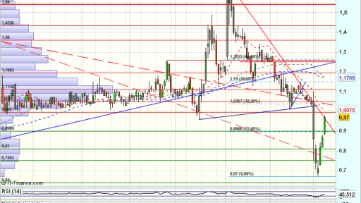Tras una violenta consolidación vuelve a impulsarse en los 0,75 hasta los 1,36, que dan paso a otro impulso bajista, derivando en un rango lateral, con base en el soporte de 1 euro, que rompe a la baja, definiendolo como de continuidad bajista.