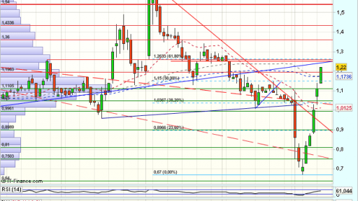 Tras una violenta consolidación vuelve a impulsarse en los 0,75 hasta los 1,36, que dan paso a otro impulso bajista, derivando en un rango lateral, con base en el soporte de 1 euro, que rompe a la baja, definiendolo como de continuidad bajista.