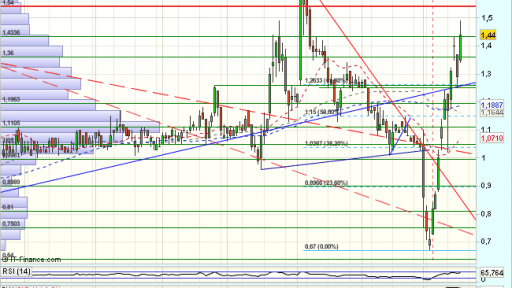 Tras una violenta consolidación vuelve a impulsarse en los 0,75 hasta los 1,36, que dan paso a otro impulso bajista, derivando en un rango lateral, con base en el soporte de 1 euro, que rompe a la baja, definiendolo como de continuidad bajista.