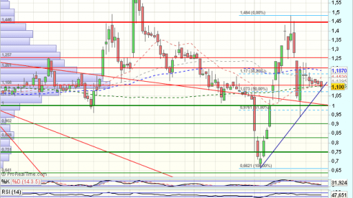 Tras una violenta consolidación vuelve a impulsarse en los 0,75 hasta los 1,36, que dan paso a otro impulso bajista, derivando en un rango lateral, con base en el soporte de 1 euro, que rompe a la baja, definiendolo como de continuidad bajista.
