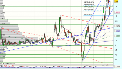 En el corto plazo, encuentra obstaculos en los 2,03 euros, que fuerzan un trhowback a soportes en los 1,6, desde donde rebota confuerza, con primeros objetivos en los …..Sigue