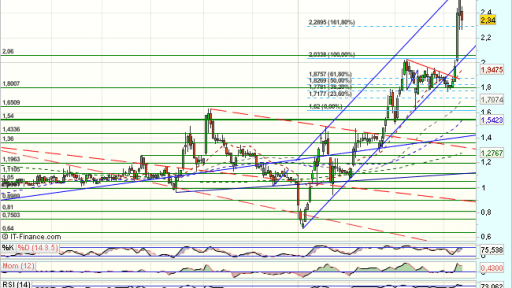 En el corto plazo, encuentra obstaculos en los 2,03 euros, que fuerzan un throwback a soportes en 1,8 euros, desde donde rebota, dando continuidad al impulso alcista, hasta los 2,66, que fuerzan una consolidación, con primeros objetivos en los …..Sigue en https://www.mercadosencontinuo.es/mapa