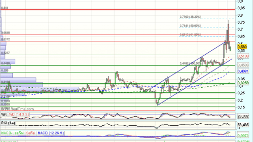 Tras una violenta consolidación vuelve a impulsarse en los 0,2 euros hasta los 0,41, que fuerzan un trhrowback hasta el soporte en los 0,15 desde donde se impulsa.
