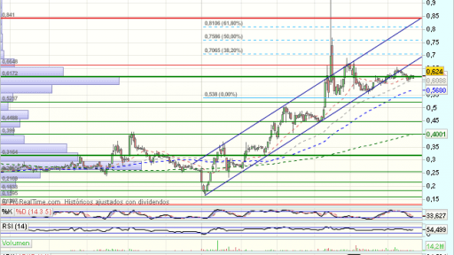 Tras una violenta consolidación vuelve a impulsarse en los 0,2 euros hasta los 0,41, que fuerzan un trhrowback hasta el soporte en los 0,15 desde donde se impulsa hasta los 0,98, que fuerzan una consolidacion.