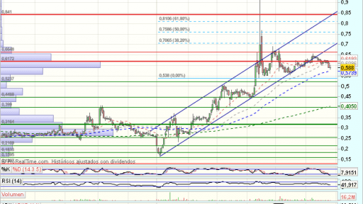 Tras una violenta consolidación vuelve a impulsarse en los 0,2 euros hasta los 0,41, que fuerzan un trhrowback hasta el soporte en los 0,15 desde donde se impulsa hasta los 0,98, que fuerzan una consolidacion.