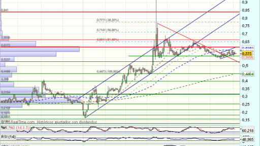 En el corto plazo, rebota hasta el techo del canal alcista y la resistencia relevante en los 0,66, que fuerzan una consolidacion en forma de triangulo rectangulo descendente, con base en el soporte de los 0,56 euros, desde donde rebota, con primeros objetivos en los …..Sigue en https://www.mercadosencontinuo.es/mapa
