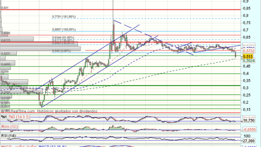 Tras una violenta consolidación vuelve a impulsarse en los 0,2 euros hasta los 0,41, que fuerzan un trhrowback hasta el soporte en los 0,15 desde donde se impulsa hasta los 0,98, que fuerzan una consolidacion.