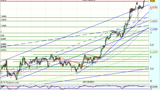 En el corto plazo, supera con fuerza el techo de los 7,08 euros, definiendo el rango lateral como de continuidad alcista y acelerando tendencia, atacando el techo del canal alcista, en una nueva muestra de fortaleza, hasta los 8,35 euros, donde inicia una consolidación lateral. Supera con fuerza la resistencia de los 8,35 euros, dando continuidad al impulso alcista con objetivos en los……….Sigue en https://www.mercadosencontinuo.es/jazztel-analisis-tecnico-41.html