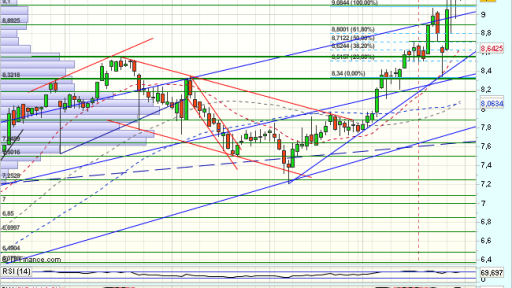 En el medio plazo el impulso se va debilitando, hasta encontrar techo en los 8,55 euros, iniciando una consolidación todavía vigente.