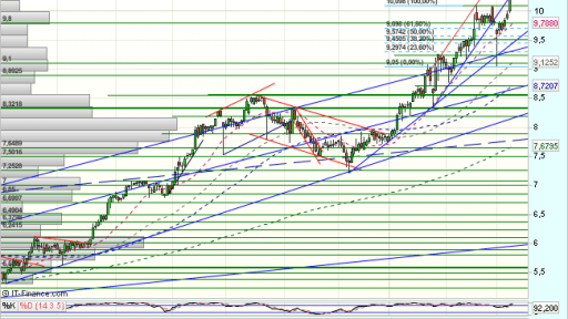 En el medio plazo el impulso se va debilitando, hasta encontrar techo en los 8,55 euros, iniciando una consolidación, hasta los 7,21, desde donde se impulsa, superando el techo del canal bajista, hasta los 10,10 euros.