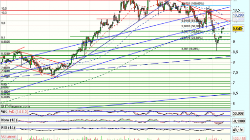 En el medio plazo el impulso se va debilitando, hasta encontrar techo en los 8,55 euros, iniciando una consolidación, hasta los 7,21, desde donde se impulsa, superando el techo del canal bajista, hasta los 11,5 euros,que fuerzan un trhrowback a soportes.