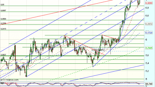 Jazztel, se encuentra bajo presión compradora en la sesión de hoy, continuando con el rebote iniciado en los 6,8 euros y cotiza con beneficios del 0,83% en los 7,038 euros, sobre la resistencia superada, ahora soporte de los 7 euros.