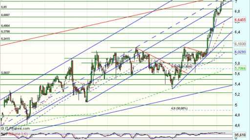 Jazztel, se encuentra nuevamente bajo presión compradora en la sesión de hoy, y cotiza con beneficios del 0,68% en los 7,0780 euros, confirmando la superación de la resistencia, ahora soporte de los 7 euros.