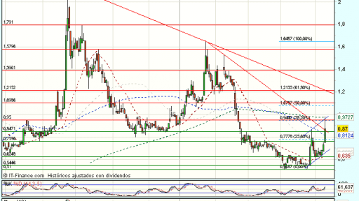 La Seda se encuentra bajo fuerte presión compradora en la sesión de hoy, llegando a superar intradía el 38,2% de recuperación de todo el impulso bajista previo y la media de 200 sesiones, y cotiza con perdidas del 18,37%, hasta los 0,87 euros, superando resistencia y máximos previos.